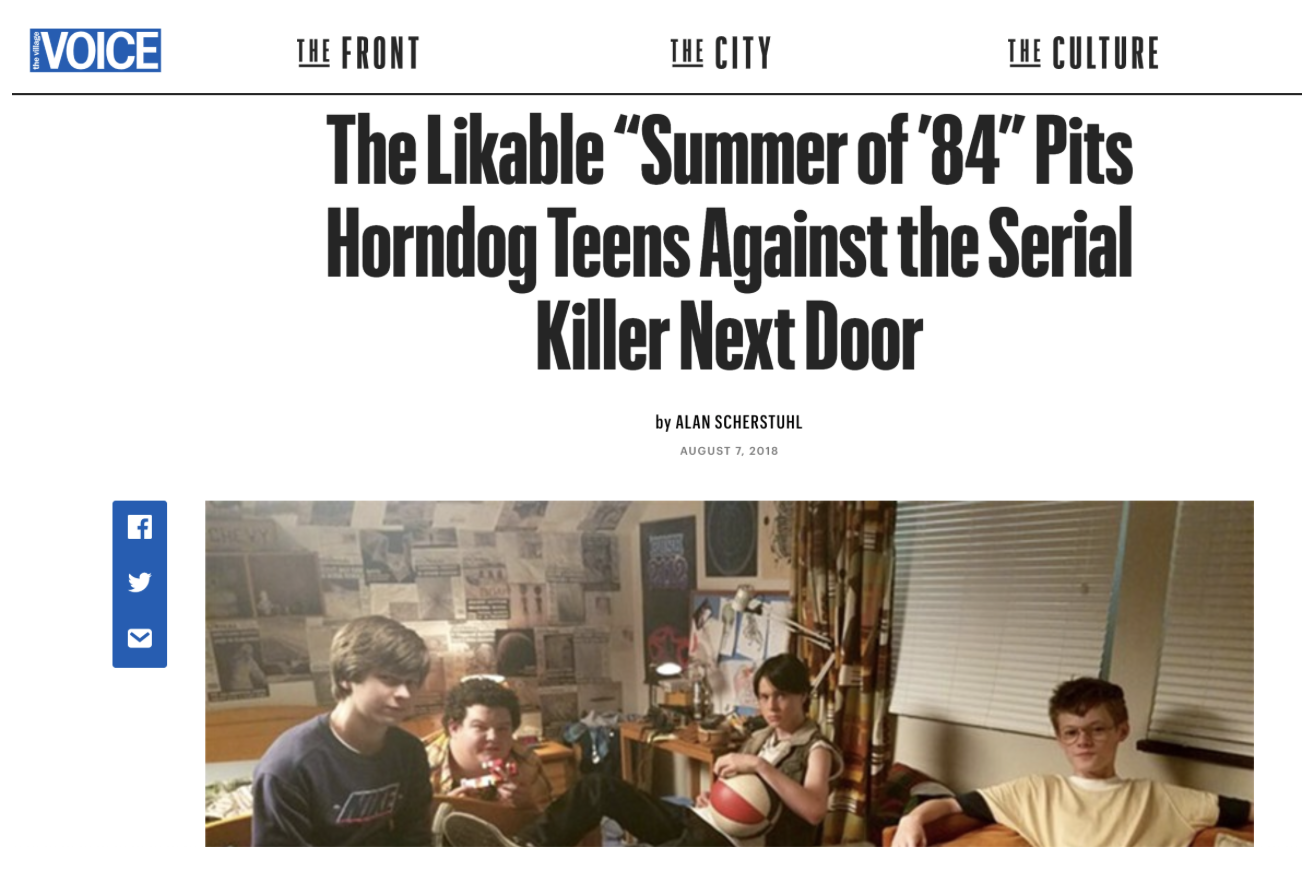 “Summer of ’84 gains in interest and urgency as it goes. …. The last forty minutes zip tensely along, including the priceless scene of Davey’s father marching the boys right over to that cop’s house and making them each apologize to his face for having gone through his trash and suspecting him of murder. It’s hilarious, uncomfortable, original, and the start of something new in what had until now been a saltily comic retread: It’s scary.”