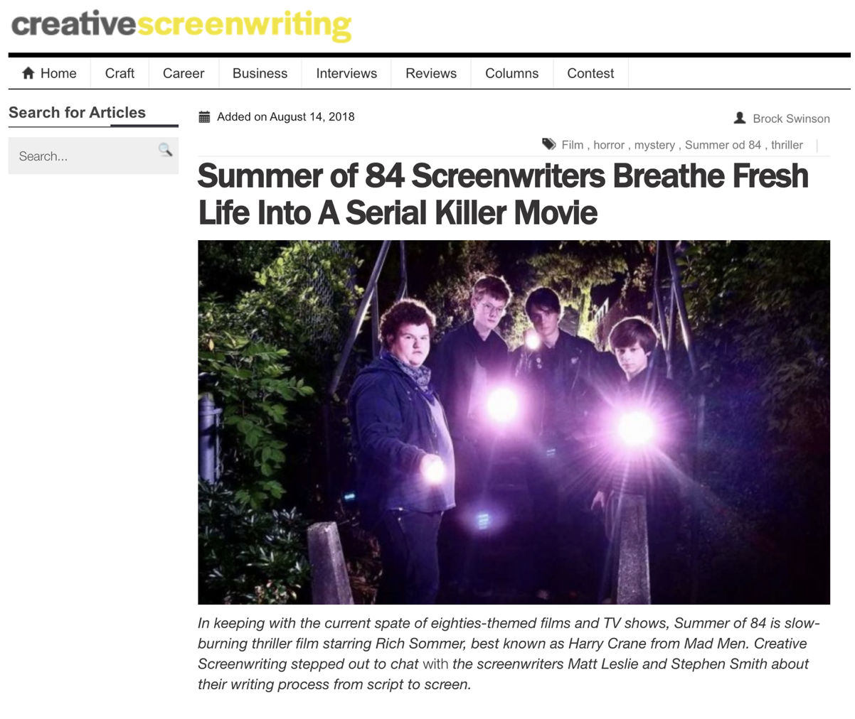Our HeadKnight, Prince, sits down with the screenwriters' Matt Leslie and Stephen J. Smith to discuss Summer of '84, their history with genre, and their future projects that they are currently working on.